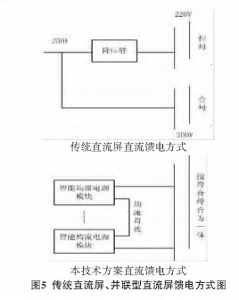 傳統(tǒng)直流屏控母和合母由于電壓不共同,負(fù)載要嚴(yán)格區(qū)別,比如,微機(jī)保護(hù).指示燈等有必要接入控母,斷路器分合閘、儲(chǔ)能電機(jī)等負(fù)載有必要接人合母。本文所論述的技能控母和合母的電壓等級(jí)共同,并聯(lián)輸出,可互用,便利用戶的使用。傳統(tǒng)直流屏、并聯(lián)型直流屏饋電方法,如圖5所示。